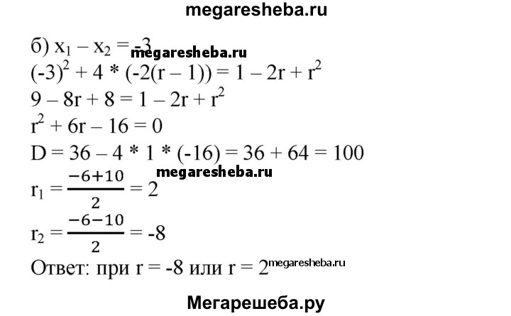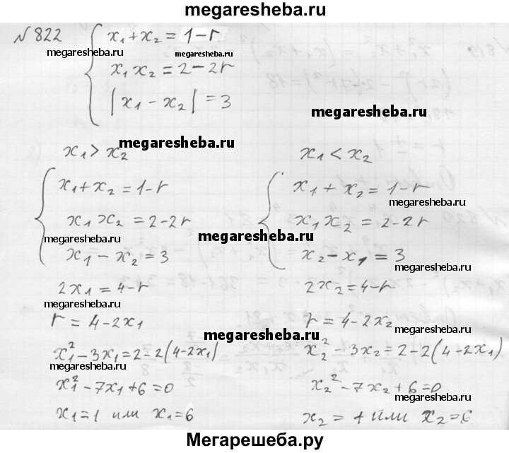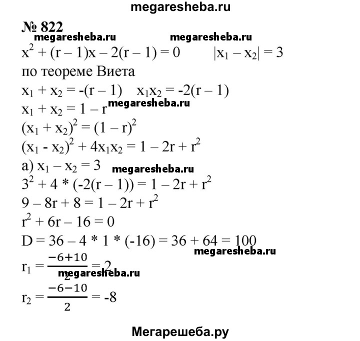 822. Найти все такие значения г, при которых квадратное уравнение х^2 + (r- 1)х-2(r- 1) = 0 имеет действительные корни x1 и х2, удовлетворяющие условию | x1 - х2│ = 3.