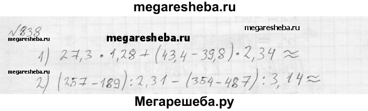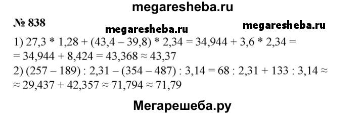 838. Вычислить на микрокалькуляторе приближенно с точностью до 0,01: 1) 27,3-1,28 + (43,4-39,8) 2,34; 2) (257 - 189): 2,31 - (354 - 487): 3,14.