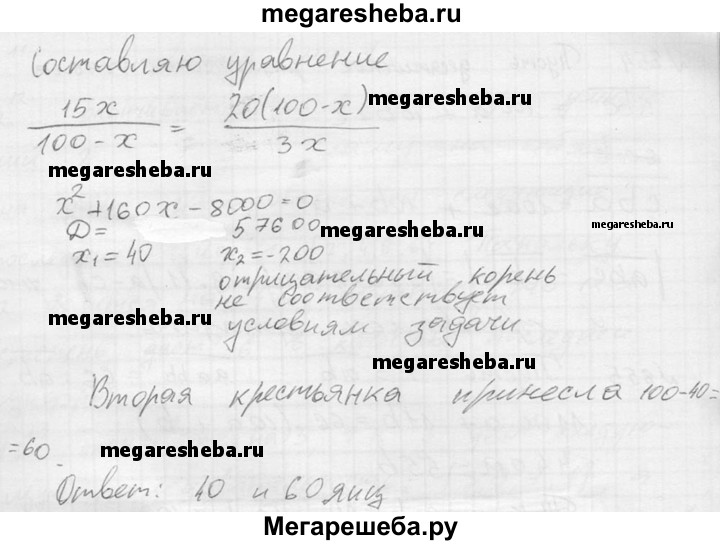 852. Две крестьянки принесли на рынок 100 яиц, одна больше, нежели другая; обе выручили одинаковые суммы. Первая сказала второй: «Будь у меня твои яйца, я выручила бы 15 крейцеров». Вторая ответила: «А будь твои яйца у меня, я выручила бы за них 6 2/3 крейцера». Сколько яиц было у каждой?