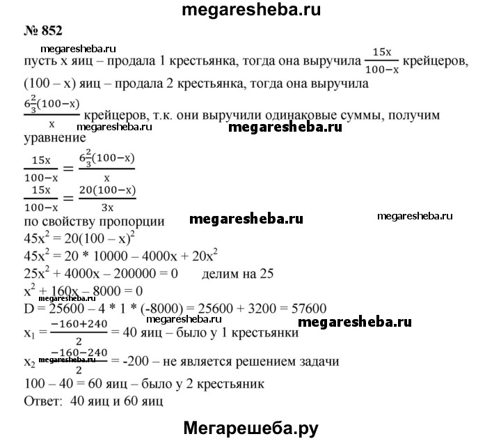 Подробный решебник (ГДЗ) по Алгебре за 8 (восьмой) класс - готовый ответ номер - 852. Авторы учебника: Алимов, Колягин, Сидоров. Издательство: Просвещение 2015.