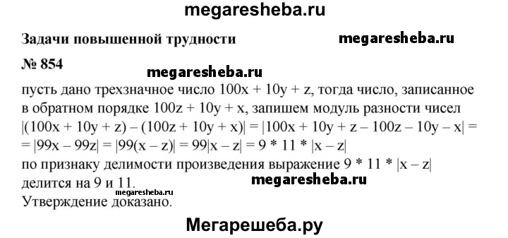 854. Доказать, что если из трехзначного числа вычесть трехзначное число, записанное теми же цифрами, что и первое, но в обратном порядке, то модуль полученной разности будет делиться на 9 и 11