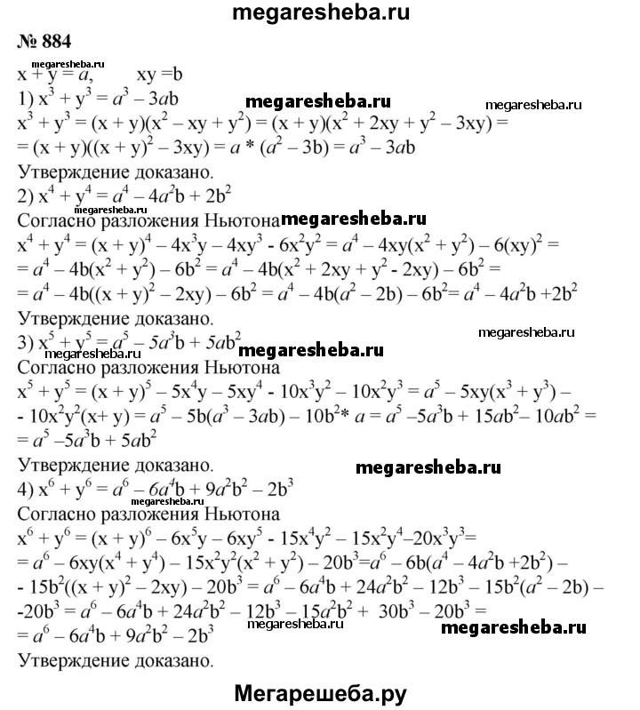 884. Пусть x + y = a,xy = b. Доказать, что: 1) х^3 + у^3 = а^3 - 3ab; 2) х^4 + у^4 = а^4 - 4a^2b + 2b^2; 3) х^5+y^5 = a^5-5a^3b + 5ab^2; 4) х^6 + у^6 = а^6-6а^4Ь + 9а^2b^2-2b^3.