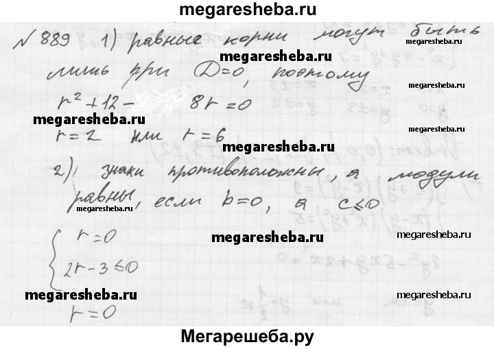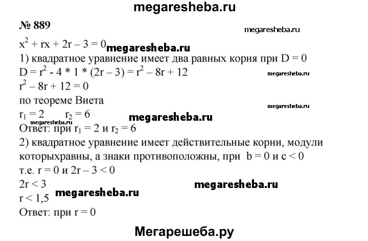 889. Найти все значения r, при которых уравнение х^2 + rх + 2r-3 = 0 имеет: 1) равные корни; 2) действительные корни, модули которых равны, а знаки противоположны.