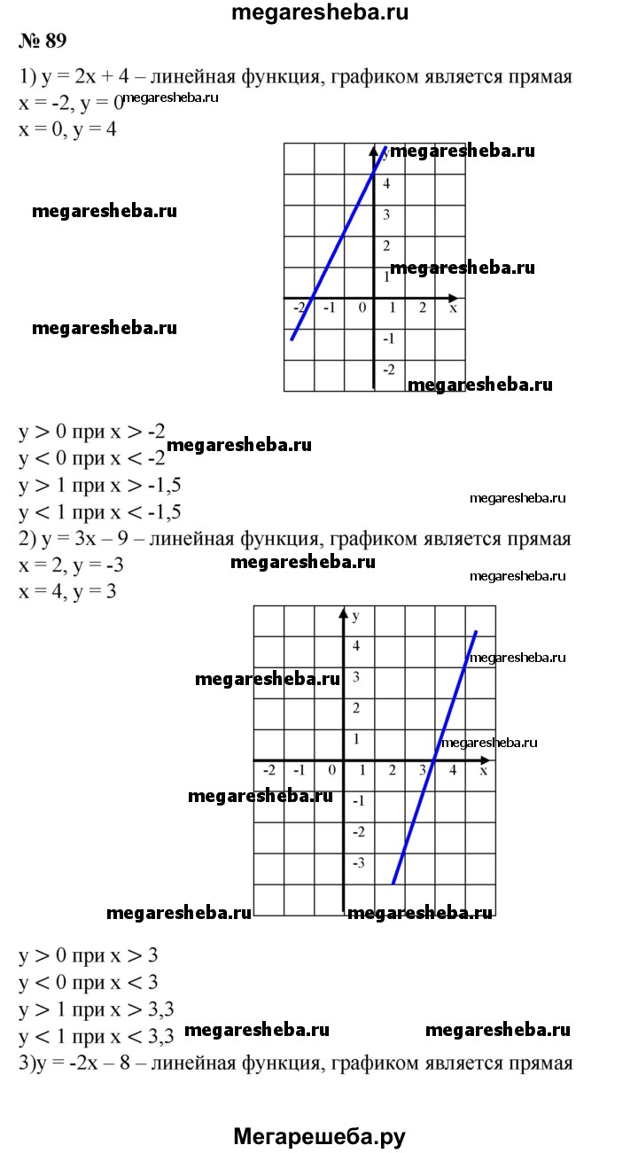 89. С помощью графика функции найти, при каких значениях х значения функции положительны, отрицательны, больше 1, меньше 1: 1) у = 2х + 4; 2) у = Зх-9; 3) у = -2х-8; 4) у=-Зх + 6.