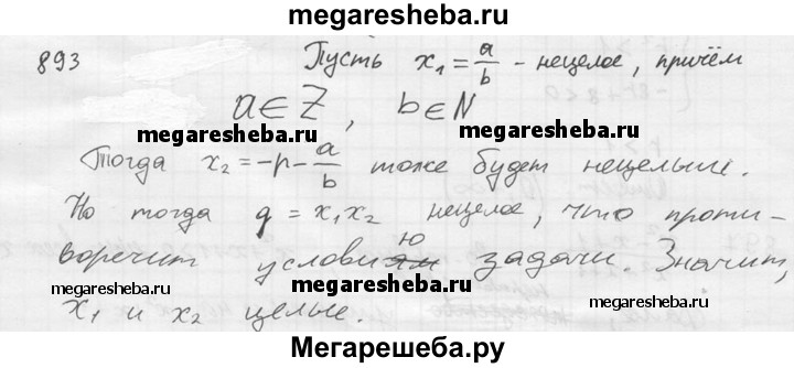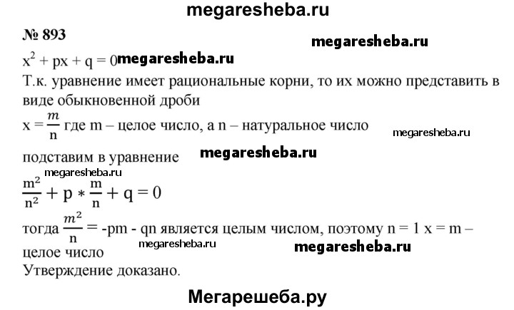 893. Доказать, что если квадратное уравнение х^2 + px + q =0, где р и q — целые числа, имеет рациональные корни, то эти корни — целые числа.