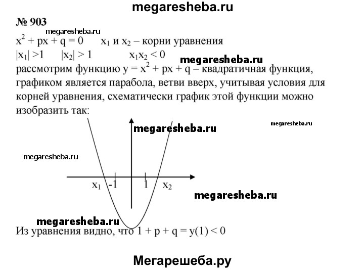 903. Известно, что корни квадратного уравнения х^2 + рх + q = 0 по модулю больше единицы и имеют разные знаки. Доказать, что p + q + 1 < 0, q - р + 1 < 0.