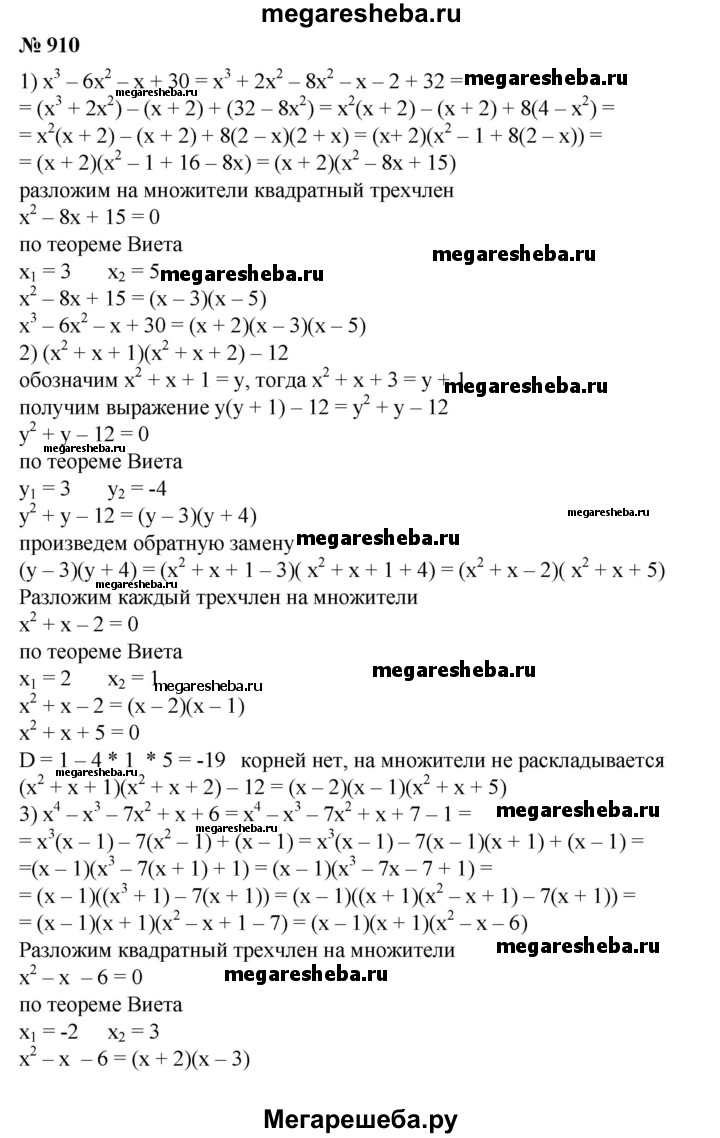 910. Разложить на множители: 1) х^3 - 6х^2 - х + 30; 2) х^4 – х^3 - 7х^2 + х + 6; 3) (х^2 + х + 1)(х^2 + х + 2) - 12; 4) (х^2 + 4х + 8)2 + Зх(х^2 + 4х + 8) + 2х^2.