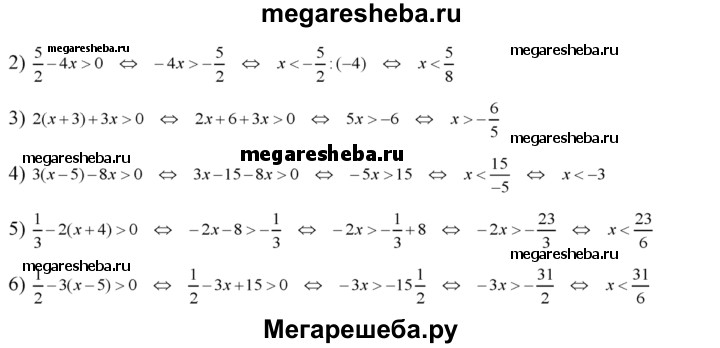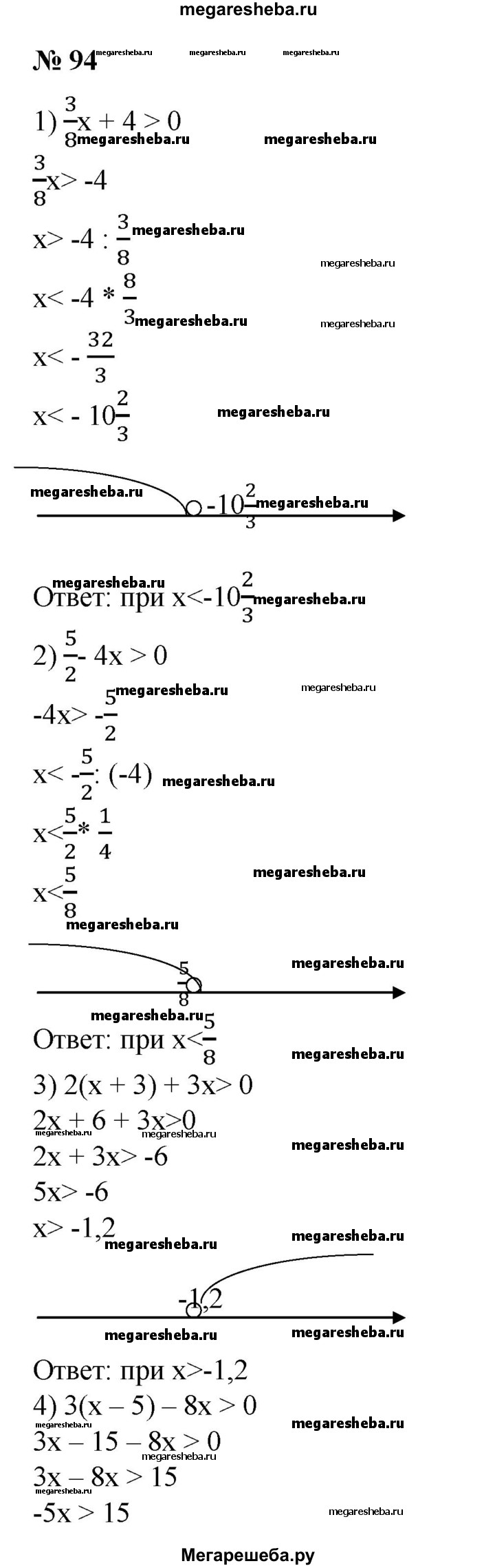 94. Выяснить, при каких значениях х выражение принимает положительные значения: 1)3/8 х + 4; 2) 5/2 -4х; 3) 2(х + 3) + 3х; 4) 3(x-5)-8x; 5) 1/3 -2(x+4); 6) 1/2 -3(x-5).