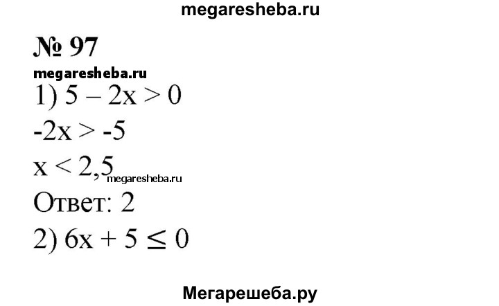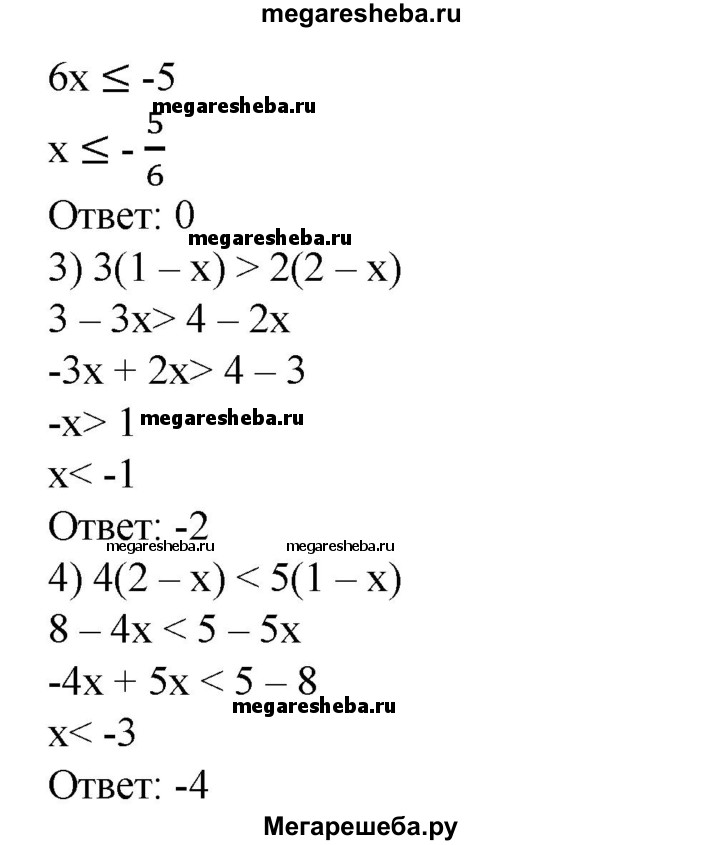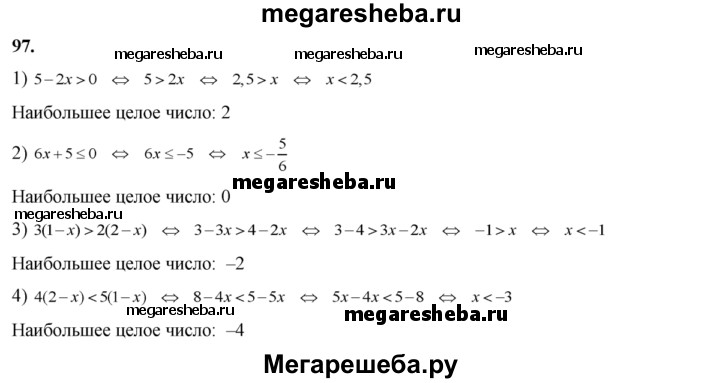 97. Найти наибольшее целое число, являющееся решением неравенства: 1) 5 - 2х > 0; 2) 6х + 5 ≤ 0; 3) 3(1 - х) > 2(2 - х); 4) 4(2 - х) < 5(1 - х).