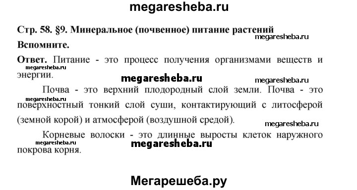 Подробный решебник (ГДЗ) по Биологии за 6 (шестой) класс - готовый ответ параграф 9 (страница) - 58. Авторы учебника: Пономарёва, Корнилова, Базовый уровень. Издательство: Просвещение 2023.