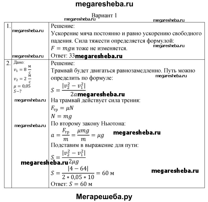 ГДЗ по физике 10 класс Ерюткин самостоятельные и контрольные работы Базовый и углубленный уровень механика динамика контрольная работа. вариант - 1