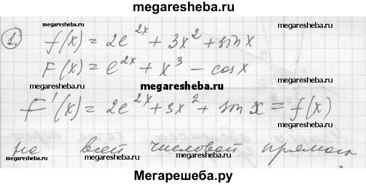 1. Показать, что функция F (х) = е^2х + х^3 - cos х является первообразной для функции f (х) = 2е^2х + Зх^2 + sin х на всей числовой прямой. 2. Для функции f (х) = Зх^2 + 2х - 3 найти первообразную, график которой проходит через точку М (1; -2). 3. Вычислить: 4. Найти площадь фигуры, ограниченной: 1) параболой у = х^2 + х - 6 и осью Ох; 2) графиками функций у = х^2 + 1 и у = 10.