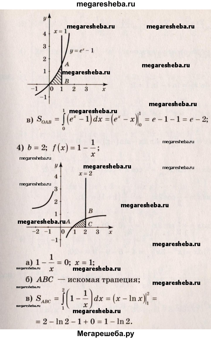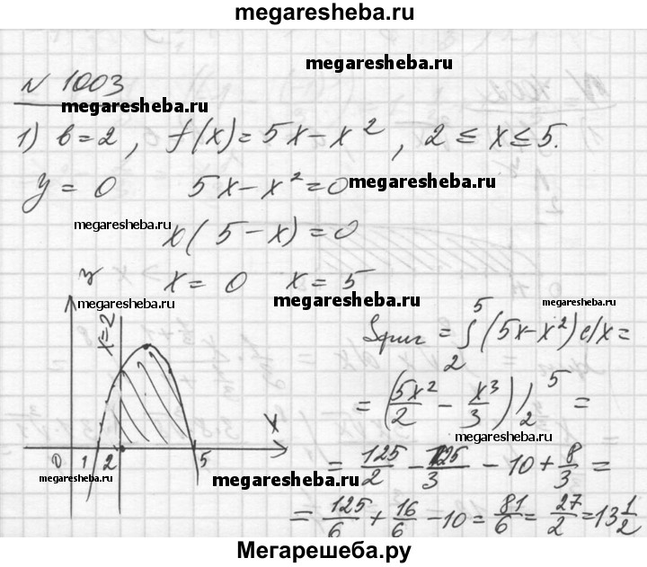 1003. Найти площадь фигуры, ограниченной прямой х = b, осью Ох и графиком функции у = f (х): 1) b = 2,f (х) = 5х – х^2, 2 ≤ х ≤ 5; 2) b = 3, f (х) = х^2 + 2х; 3) b = 1, f (x) = e^x- 1; 4) b = 2, f (х)=1 – 1/x.