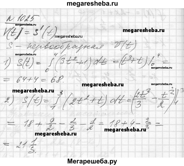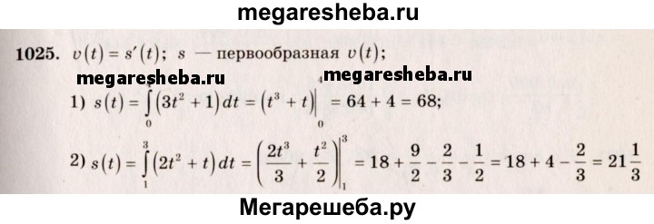 1025. Тело движется прямолинейно со скоростью v (f) (м/с). Вычислить путь, пройденный телом за промежуток времени от t = t1 до t = t2: 1) v (t) = 3t^2 +1, t1 = 0, t2 = 4; 2) v (t) = 2t^2 + t, t1 = 1, t2 = 3.