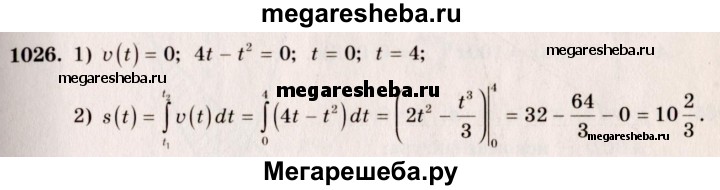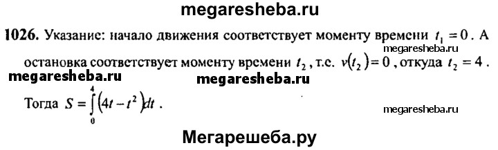 1026. Скорость прямолинейно движущегося тела равна v (t) = 4t – t^2. Вычислить путь, пройденный телом от начала движения до остановки.