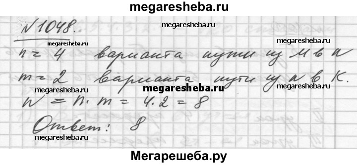 1048. Чтобы попасть из города М в город К, нужно проехать через город N. Между городами М и N имеются четыре автодоро¬ги, а из города N в город К можно попасть либо поездом, либо самолетом. Сколько существует различных способов добраться из города М в город К?