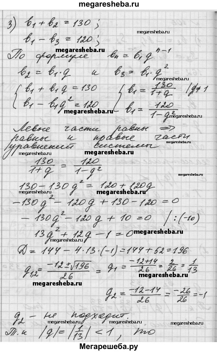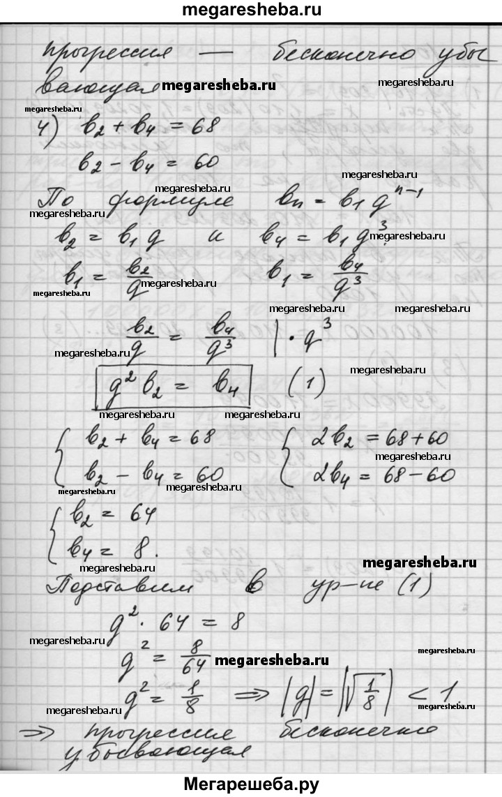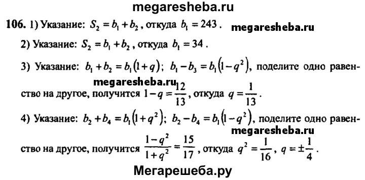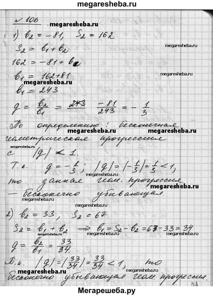 106. Показать, что геометрическая прогрессия является бесконечно убывающей, если: 1) b2 = -81, S2= 162; 2) b2 = 33, S2 = 67; 3) b1 + b2= 130, b1 - b3 = 120; 4) b2 + b4 = 68, b2 - b4 = 60.