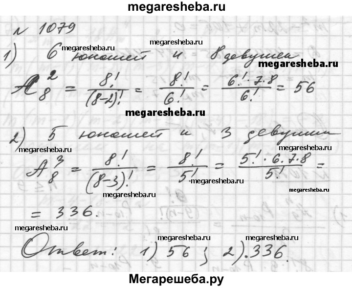 1079. В шахматном турнире участвуют: 1) 6 юношей и 2 девушки; 2) 5 юношей и 3 девушки. Сколькими способами могут распределиться места среди девушек, если все участники турнира набирают разное количество очков.
