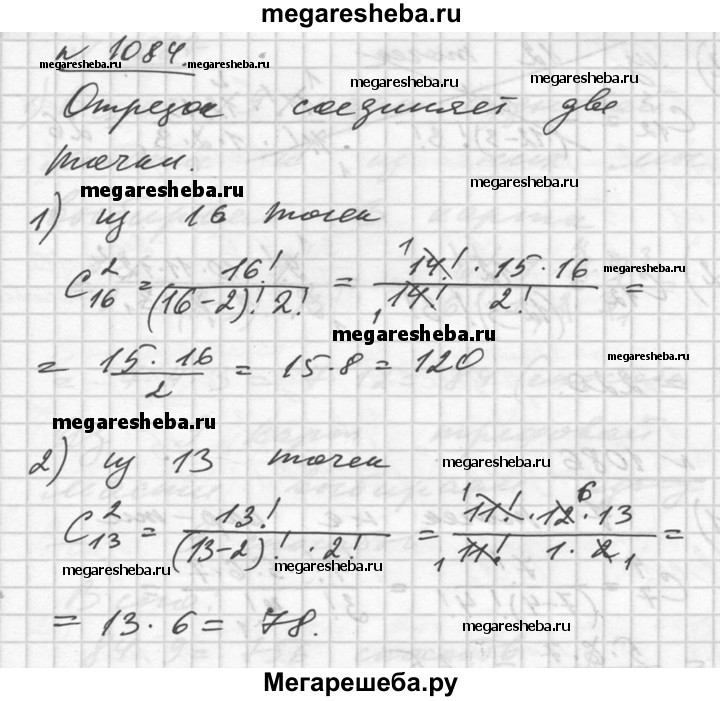 1084. На плоскости отмечено: 1) 16 точек; 2) 13 точек, причём никакие 3 из них не лежат на одной прямой. Сколько различных отрезков можно построить, соединяя эти точки попарно?