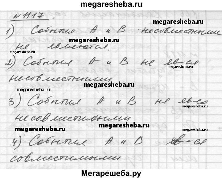 1117. (Устно.) Выяснить, являются ли события А и В несовместными, если: 1) А — появление туза, В — появление дамы в результате одного изъятия одной карты из колоды карт; 2) А — появление туза, В — появление карты бубновой ма¬сти в результате одного изъятия одной карты из колоды; 3) А — выпадение числа 6, В — выпадение чётного числа при одном бросании игральной кости; 4) А — выпадение числа 4, В — выпадение нечётного числа в результате одного броска игральной кости.