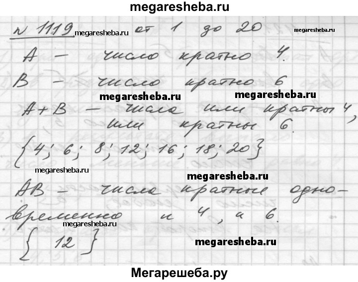 1119. Двадцать карточек пронумерованы числами от 1 до 20. Произвольно из них выбирается одна карточка. Пусть событие А — на карточке записано число, кратное 4; событие В — на карточке записано число, кратное 6. Выяснить, в чём состоят события А + В и АВ.