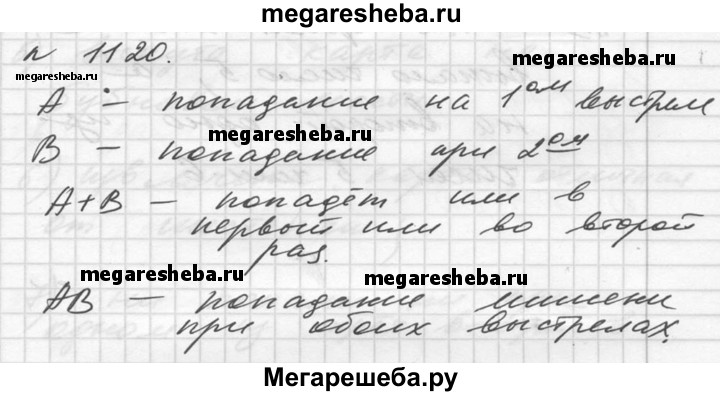 1120. (Устно.) Испытание состоит из двух выстрелов по мишени. Событие А — попадание по мишени при первом выстреле, В — попадание при втором выстреле. Пояснить, в чём состоят события А + В и АВ.
