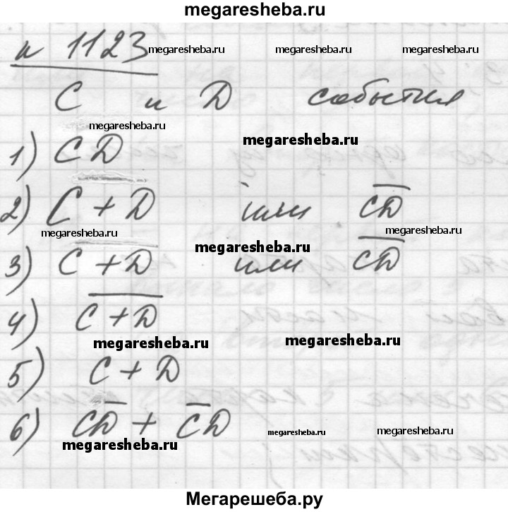 1123. Пусть С и D — произвольные события. Записать следующие события: 1) произошли оба данных события; 2) произошло только событие С; 3) произошло только событие D; 4) ни одно из данных событий не произошло; 5) произошло, по крайней мере, одно из данных двух событий; 6)* произошло только одно из данных событий.