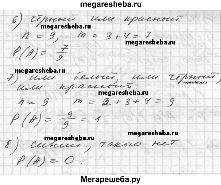 1127. В коробке находятся 2 белых, 3 чёрных и 4 красных шара. Наугад вынимается один шар. Найти вероятность того, что вынутый шар: 1) белый; 2) чёрный; 3) красный; 4) белый или чёрный; 5) белый или красный; 6) чёрный или красный; 7) или белый, или чёрный, или красный; 8) синий.