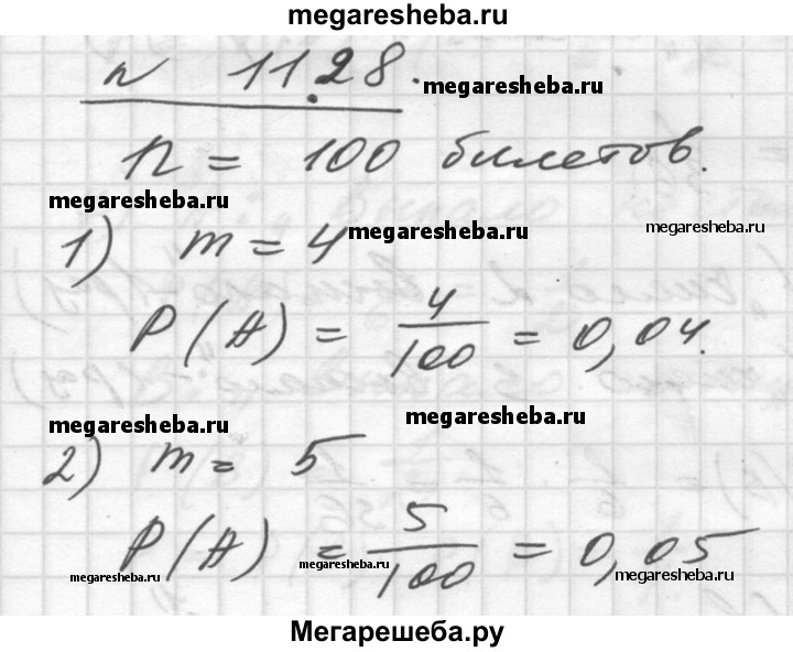1128. В лотерее участвуют 100 билетов, среди которых: 1) 4 выигрышных; 2) 5 выигрышных. Наугад берут один билет. Какова вероятность того, что взятый билет выигрышный?