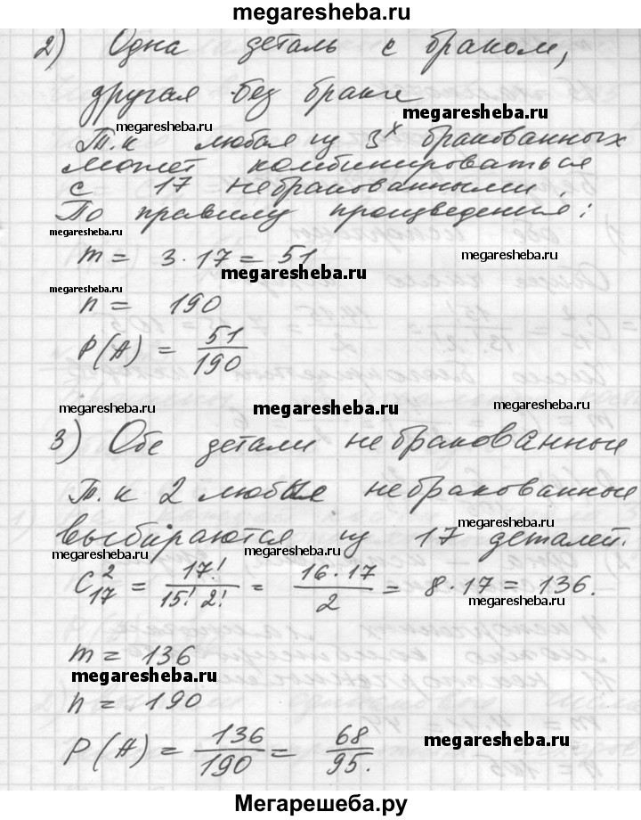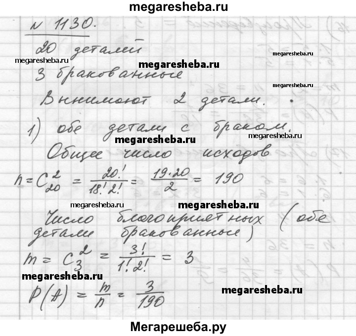1130. Среди 20 деталей, лежащих в ящике, 3 детали бракованные. Наугад вынимают 2 детали. Какова вероятность того, что: 1) обе детали оказались бракованными; 2) одна деталь бракованная, а другая нет; 3) обе детали не бракованные?