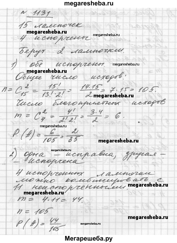 1131. Среди 15 лампочек 4 испорчены. Наугад берут 2 лампочки. Какова вероятность того, что: 1) обе выбранные лампочки испорчены; 2) одна лампочка исправная, а одна — испорченная; 3) обе лампочки исправные?