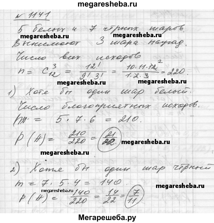 1141. В коробке лежат 5 белых и 7 чёрных шаров. Наугад вынимают 3 шара. Найти вероятность того, что среди них окажется по крайней мере один: 1) белый шар; 2) чёрный шар.