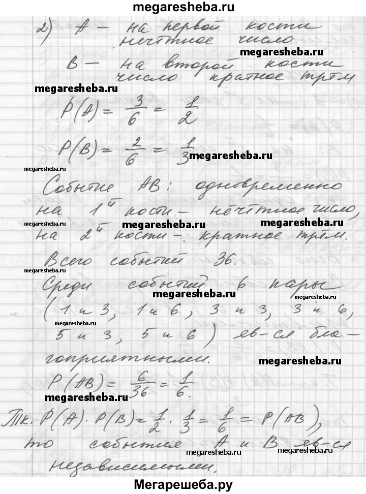 1147. Бросаются две игральные кости и рассматриваются события: 1) А — на первой кости выпало число 6, В — на второй кости выпало чётное число; 2) А — на первой кости выпало нечётное число, В — на второй кости выпало число, кратное 3. Убедиться с помощью формулы (1) в независимости событий А и В.