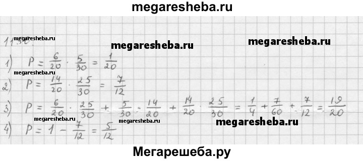 1150. В первой партии из 20 деталей 6 нестандартных, а во второй партии из 30 деталей 5 нестандартных. Наугад из каждой партии изымают по одной детали. Найти вероятность того, что: 1) обе детали оказались нестандартными; 2) обе детали оказались стандартными; 3) хотя бы одна деталь оказалась стандартной; 4) хотя бы одна деталь оказалась нестандартной.