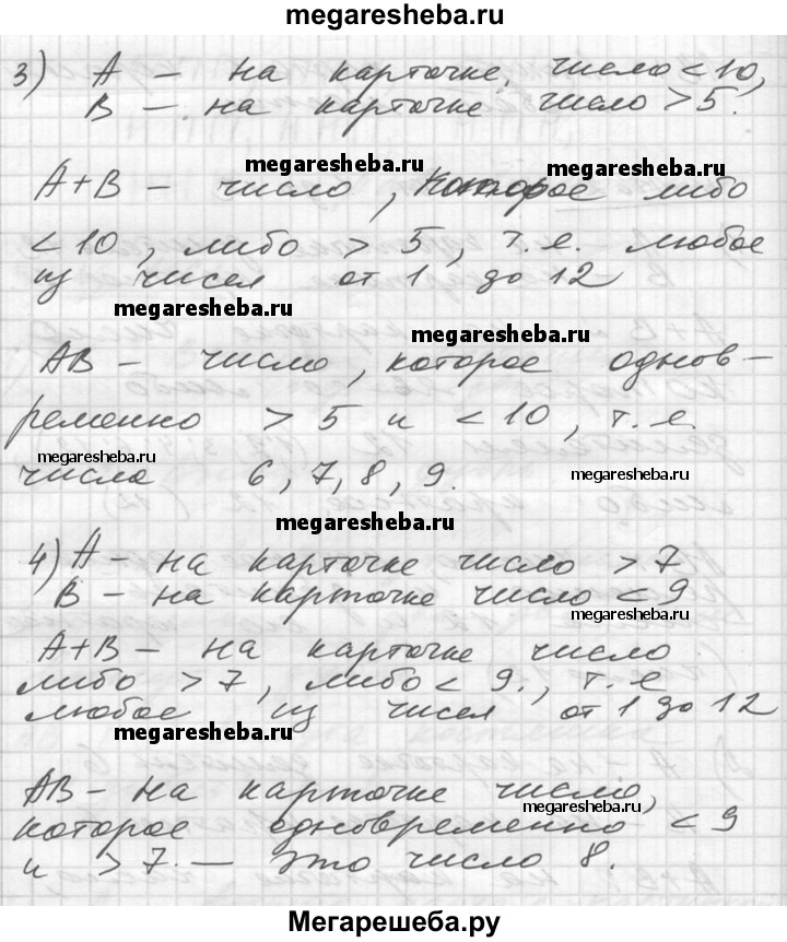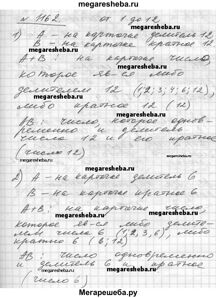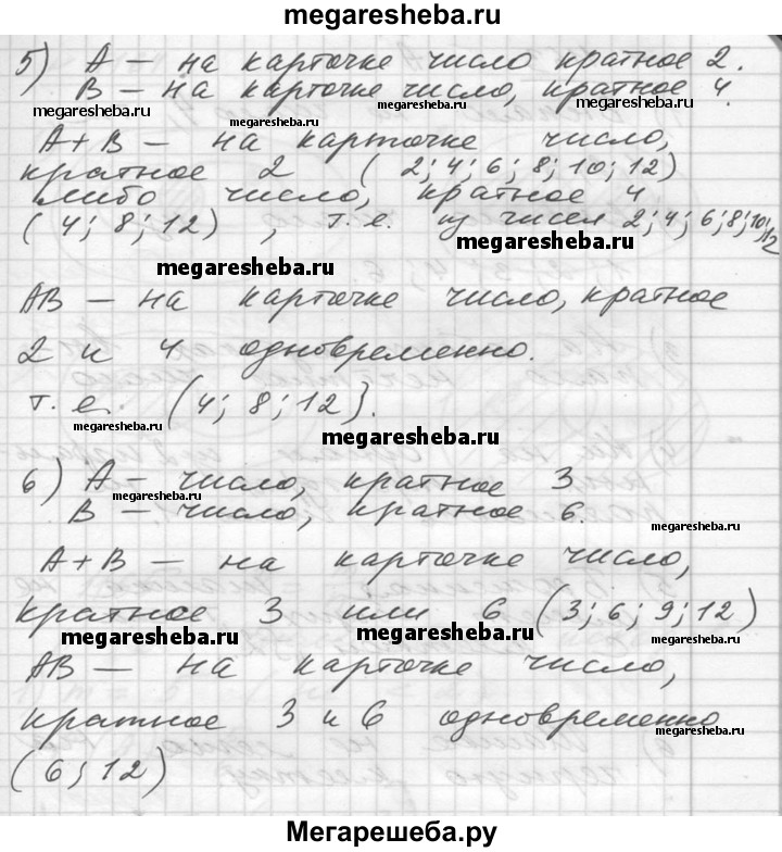 1162. Двенадцать карточек пронумерованы натуральными числами от 1 до 12. Случайным образом выбирается одна карточка. Рассматриваются события: 1) А — на карточке записан делитель числа 12, В — записано число, кратное 12; 2) А — на карточке делитель числа 6, В — на карточке число, кратное 6; 3) А — на карточке число, меньшее 10, В — на карточке число, большее 5; 4) А — на карточке число, большее 7, В — на карточке число, меньшее 9; 5) А — на карточке число, кратное 2, В — на карточке число, кратное 4; 6) А — на карточке число, кратное 3, В — на карточке число, кратное 6. Установить, в чём состоят события А + В и АВ.