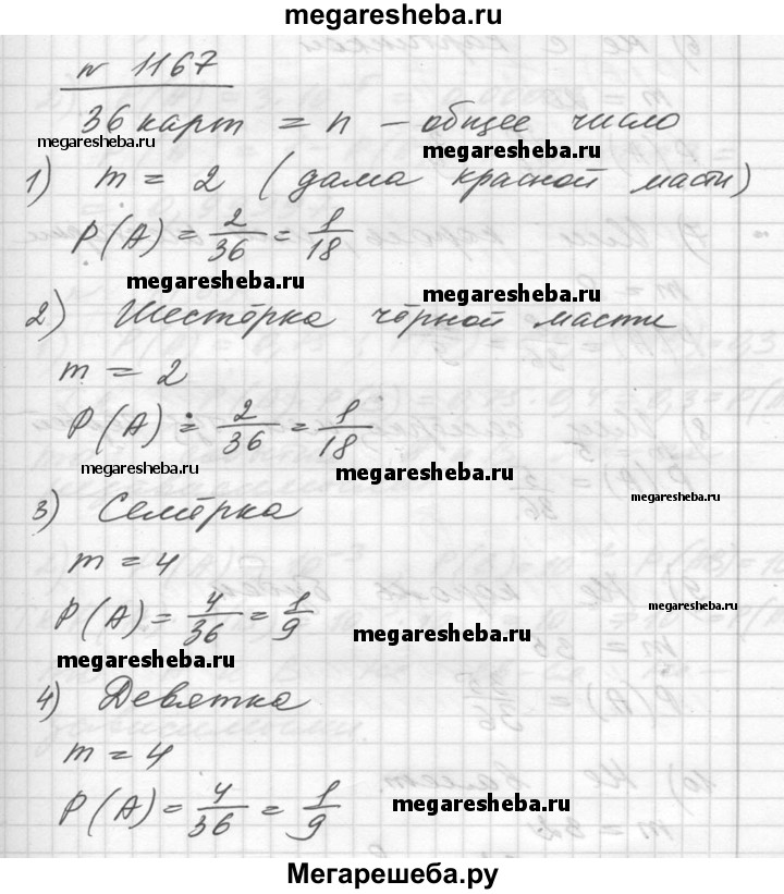 1167. Из колоды карт в 36 листов наугад вынимается одна карта. Найти вероятность того, что эта карта: 1) дама красной масти; 2) шестёрка чёрной масти; 3) семёрка; 4) девятка; 5) с картинкой; 6) не с картинкой; 7) или король, или шестёрка; 8) или семёрка, или туз червей; 9) не король бубен; 10) не валет.