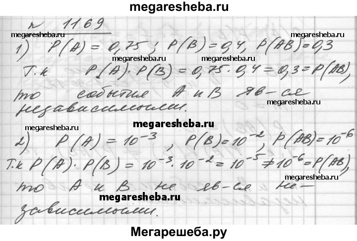1169. Установить, являются ли события С и В независимыми, если: 1) Р (А) = 0,75, Р (В) = 0,4, Р (АВ) = 0,3; 2) Р (А) = 10^-3, Р (В) = 10^-2, Р (АВ) = 10^-6.