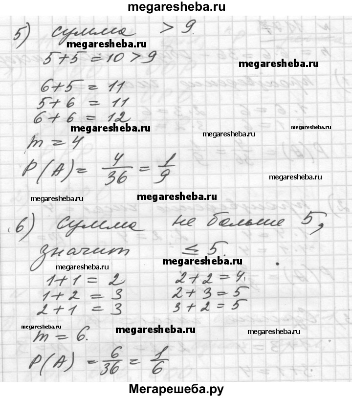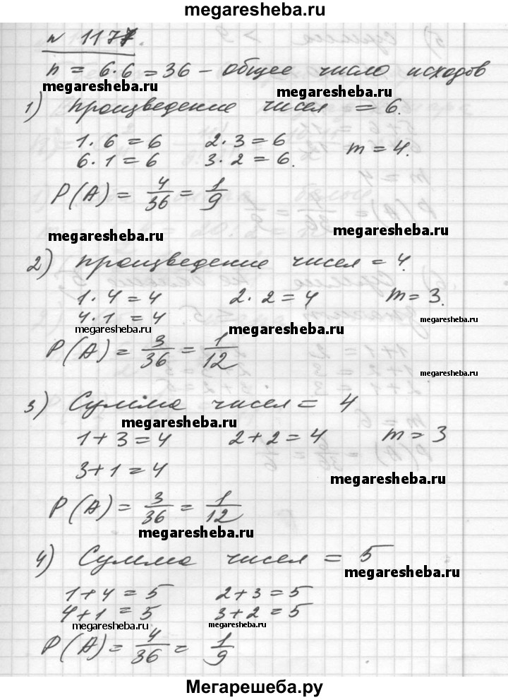 1177. Бросают две игральные кости. Найти вероятность события: 1) произведение появившихся чисел равно 6; 2) произведение появившихся чисел равно 4; 3) сумма выпавших чисел равна 4; 4) сумма выпавших чисел равна 5; 5) сумма выпавших чисел больше 9; 6) сумма выпавших чисел не больше 5.