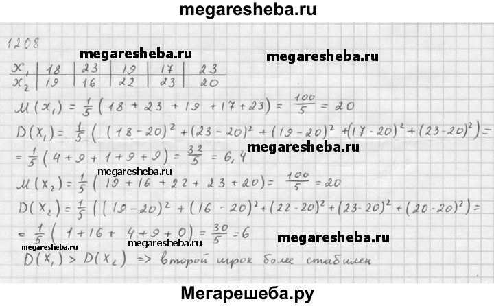 1208. Двух футболистов, участвующих в играх пяти сезонов и забивших одинаковое количество голов (см. таблицу), сравнить по стабильности результатов. Условный номер сезона 1 2 3 4 5 Число голов, забитых 1-м фут¬болистом 18 23 19 17 23 Число голов, забитых 2-м фут¬болистом 19 16 22 23 20