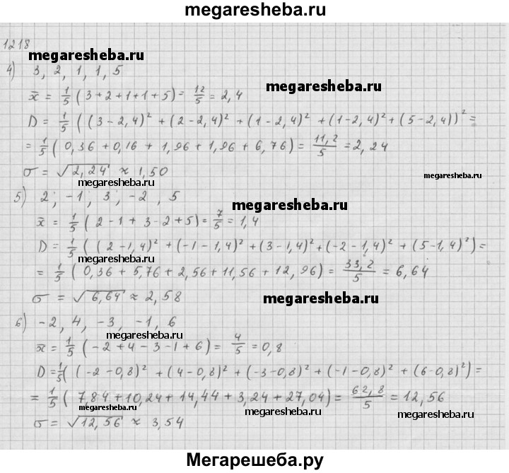 1218. Найти дисперсию и среднее квадратичное отклонение выборки: 1) 3, 8, 5, 6; 2) 4, 7, 3, 9; 3) 4, 1, 3, 2, 2; 4) 3, 2, 1, 1, 5; 5) 2, -1, 3, -2, 5; 6) -2, 4, -3, -1, 6.