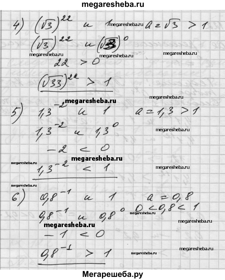 122. Пользуясь свойствами степенной функции, сравнить с единицей: 1) 4,1^12; 2) 0,2^3; 3) 0,7^9; 4) (√3)^22; 5) 1,3^-2; 6) 0.8^-1.