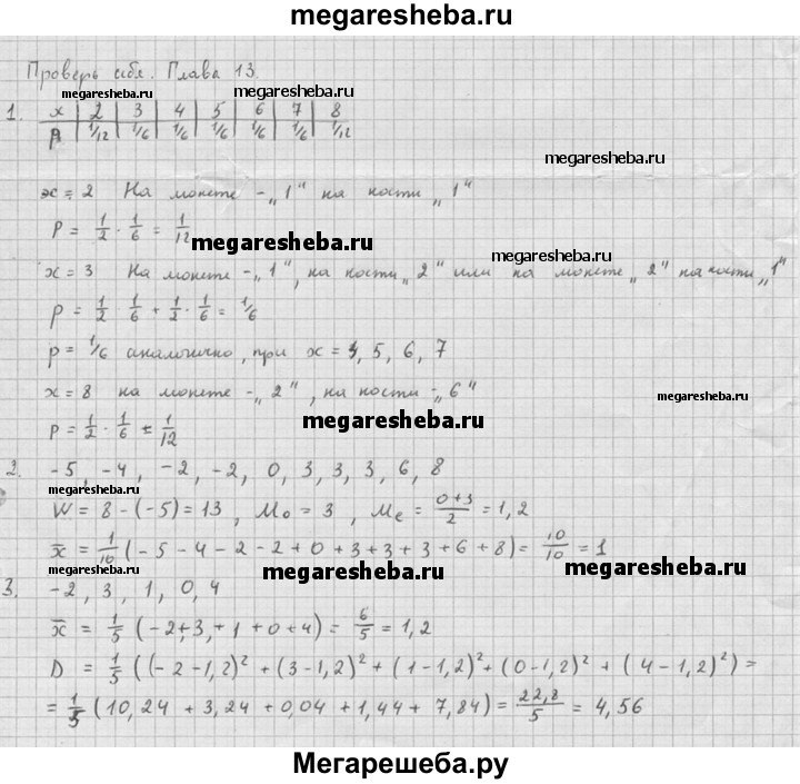 1. На стол бросают монету (на одной из сторон которой записа¬но число 1, на другой — число 2) и игральный кубик (грани которого пронумерованы числами от 1 до 6). Составить вероятностную таблицу распределения значений случайной величины X — суммы чисел, появившихся на монете и на кубике. 2. Найти размах, моду, медиану и среднее выборки: -5, 6, 3, 8, 3, -2, -4, 0, 3, -2. 3. Найти дисперсию выборки: -2, 3, 1, 0, 4.