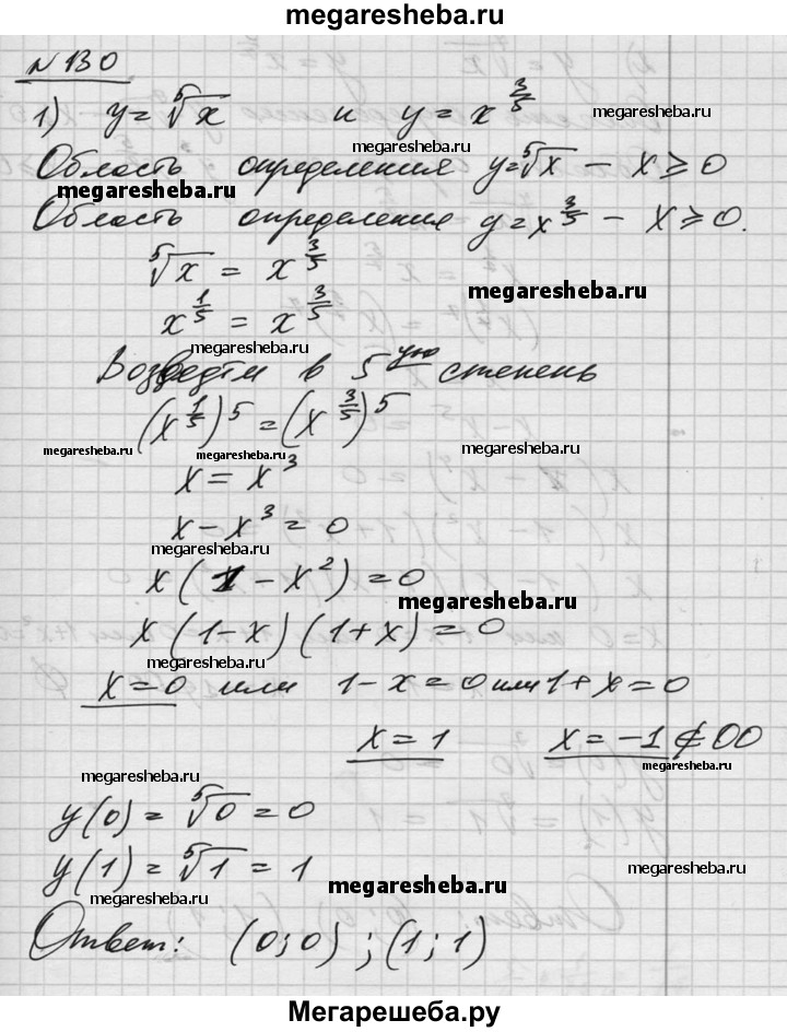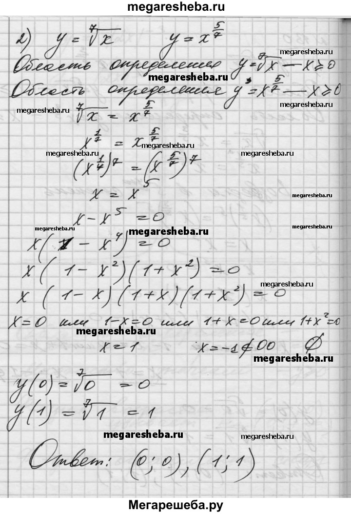 130. Найти координаты точки пересечения графиков функций: 1) у = ^5√х и у = х^3/5 ; 2) у = ^7√x И у = х^5/7.