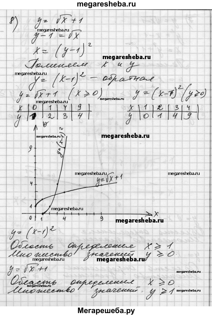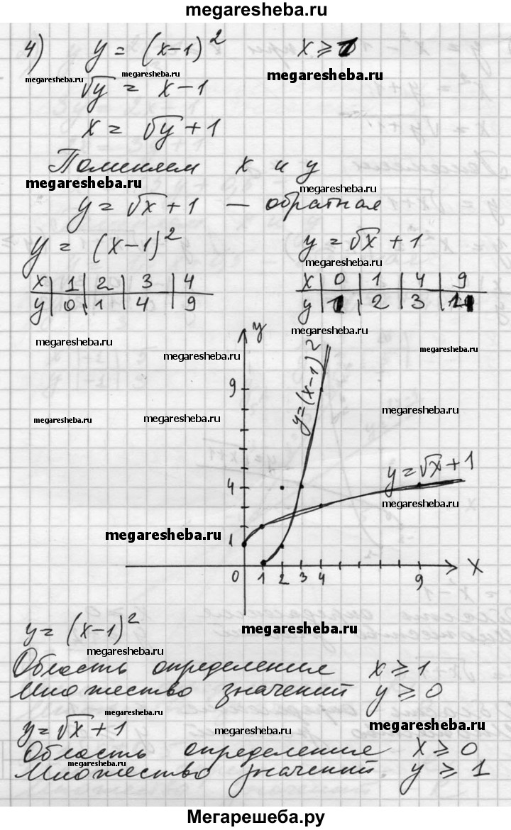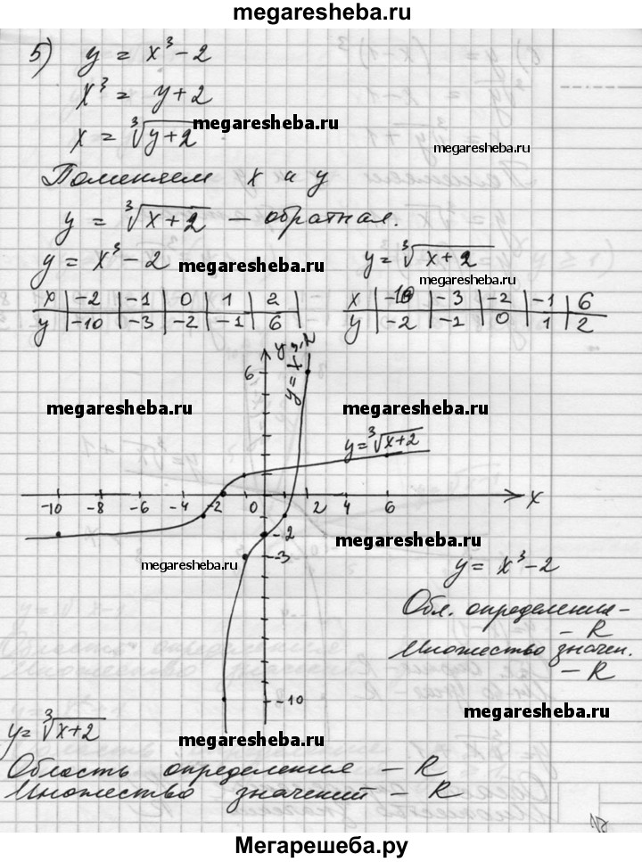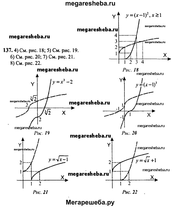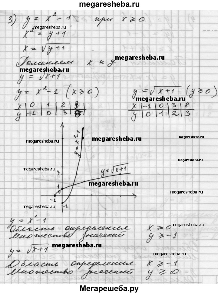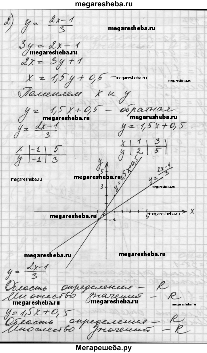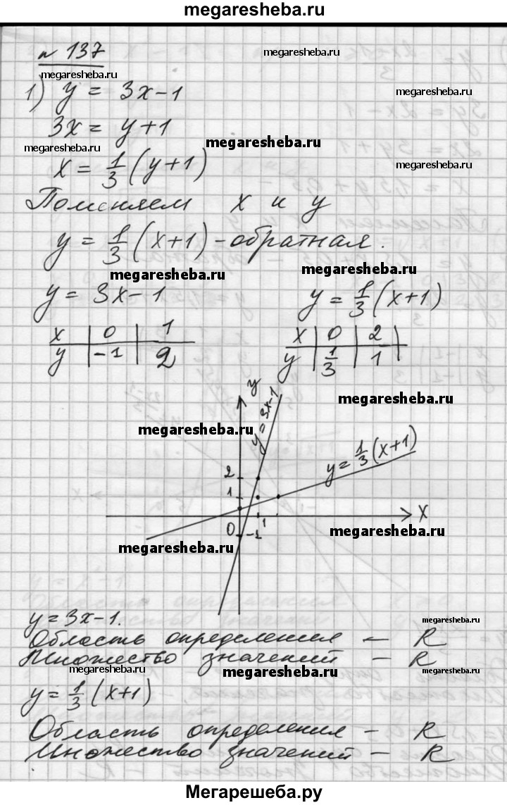 137. На одном рисунке построить график данной функции и функции, обратной к данной; найти область определения и множество значений каждой из них: 1) у = Зх-1; 2) y = 2x-1 / 3; 3) у = х^2 - 1 при х ≥ 0; 4) у = (х - 1)^2 при х ≥ 1; 5) у = х^3 - 2; 6) у = (х- 1)^3; 7) y = √x-1 8) y = √x + 1.