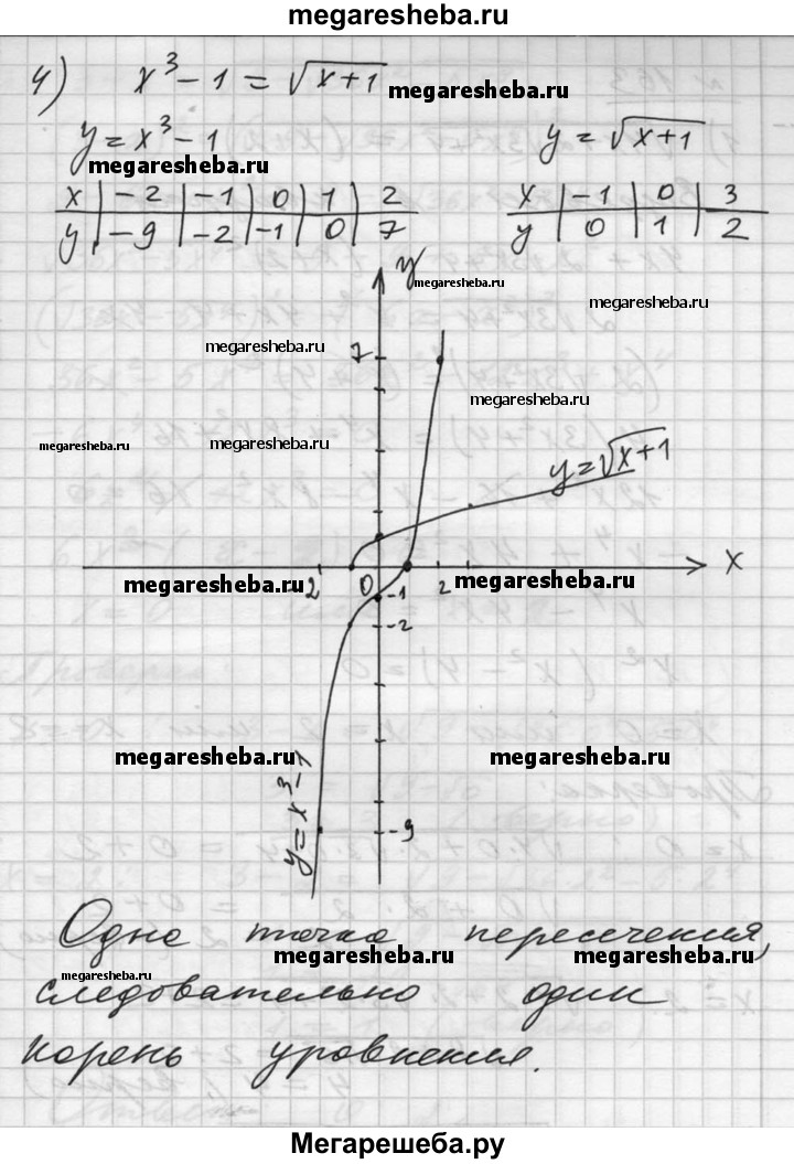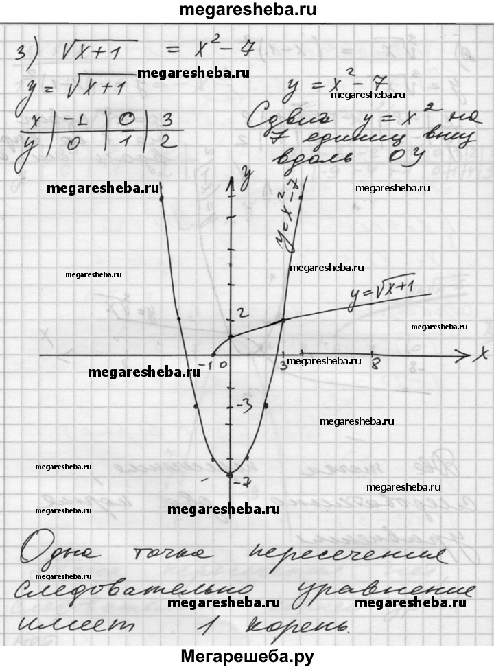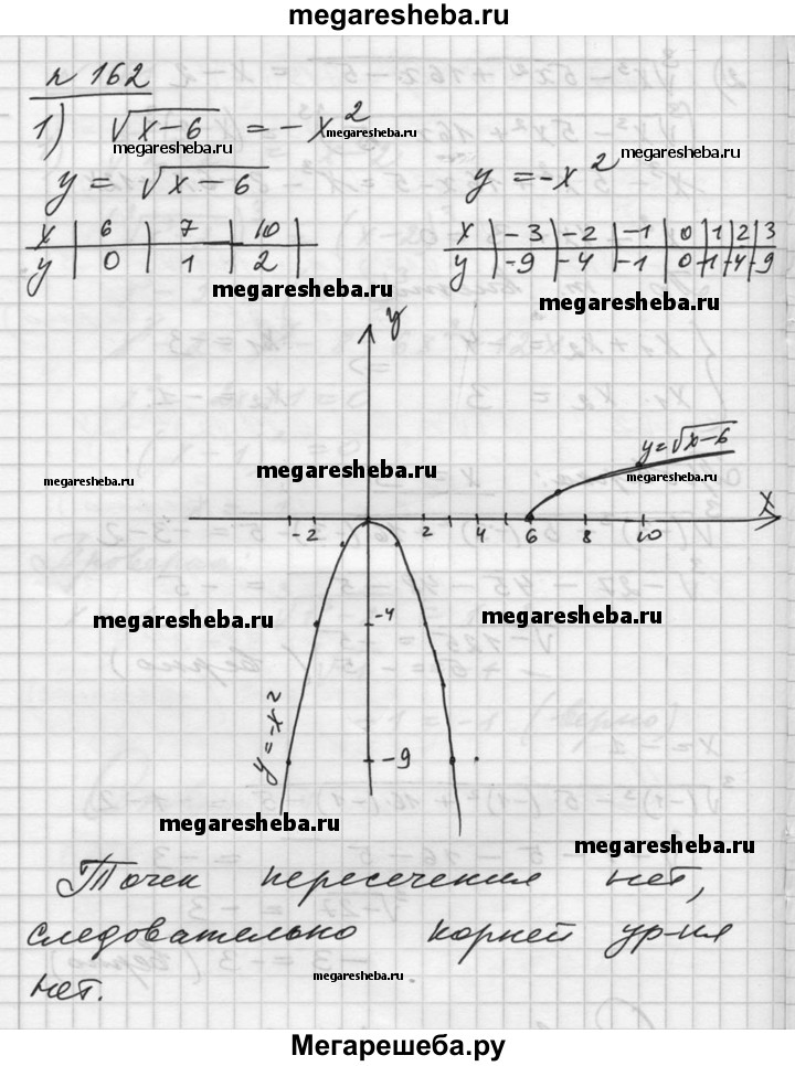 162. Выяснить с помощью графиков, сколько корней имеет уравнение: 1) √х-6 = -х^2; 2) ^3√х = (х-1)^2; 3) √x + 1 = х^2 - 7; 4) х^3 - 1 = √х+1.