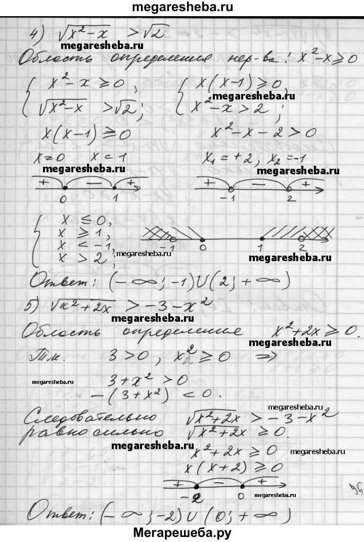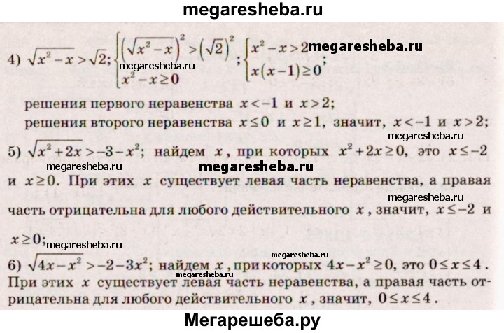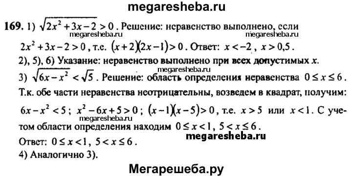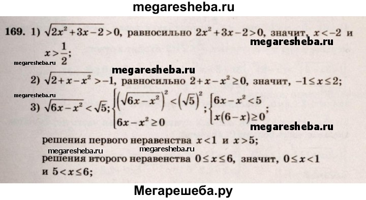 169. Решить неравенство 1) √2х^2 + Зх-2 > 0; 2) √2 + х-х^2 > -1; 3) √6х – х^2 < √5; 4) √х^2 - х > √2; 5) √х^2 + 2х > -3-х^2; 6) √4х-х^2 > -2 – Зх^2.