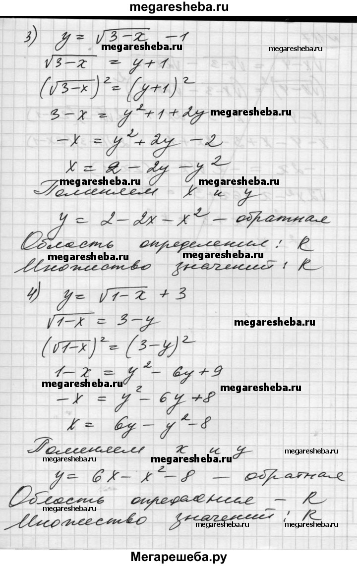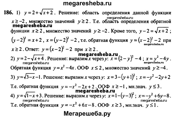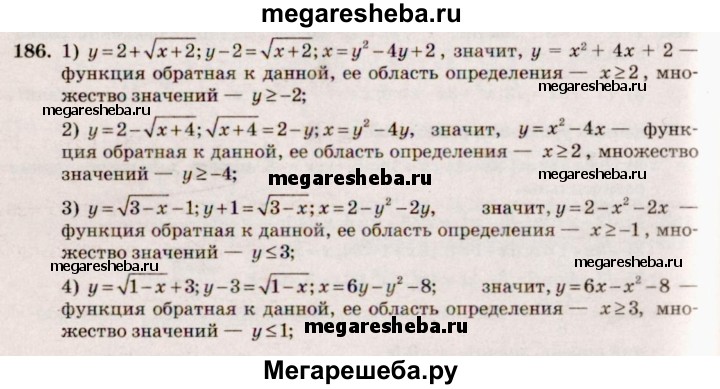 186. Найти функцию, обратную к данной, её область определения и множество значений: 1) у = 2 + √х + 2; 2) у = 2 - √х + 4; 3) у = √З-х-1; 4) y= √1-х + З.