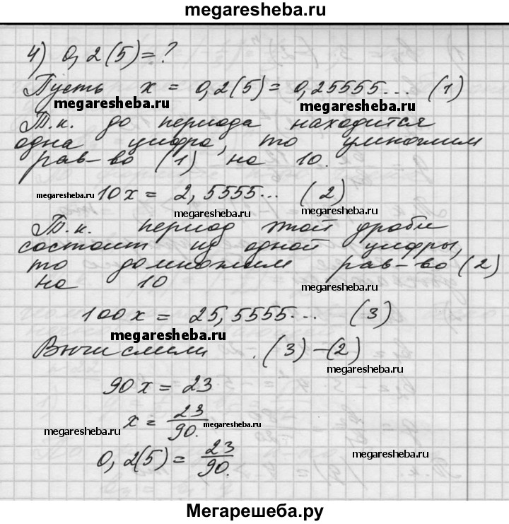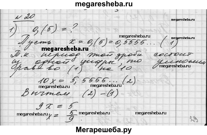 20. Записать бесконечную периодическую десятичную дробь в виде обыкновенной дроби: 1) 0,(5); 2) 0,(8); 3) 0,(32); 4) 0,2(5).