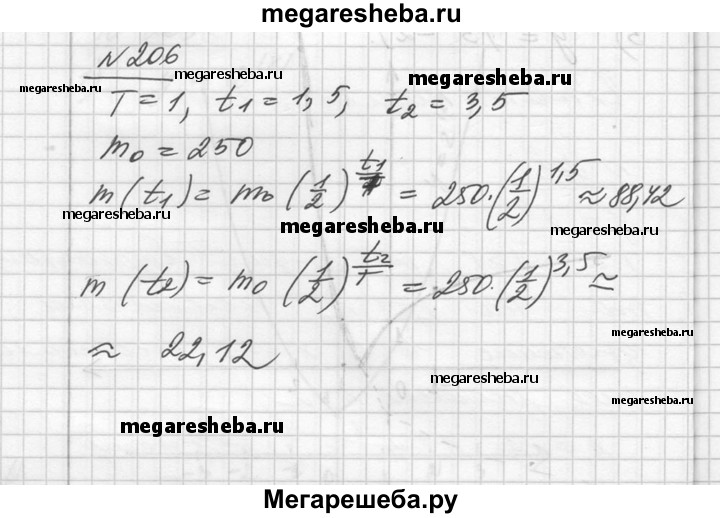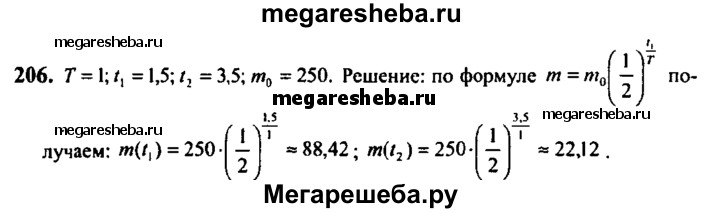 206. При радиоактивном распаде количество некоторого вещест¬ва уменьшается вдвое за сутки. Сколько вещества останется от 250 г через 1,5 суток? через 3,5 суток? Вычисления прове¬сти на микрокалькуляторе.