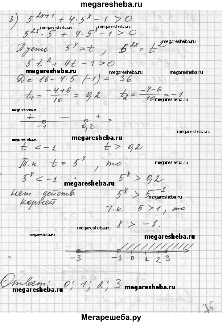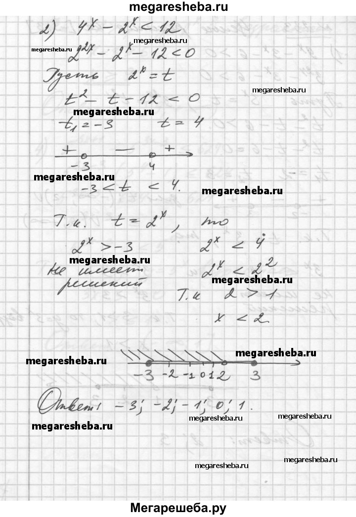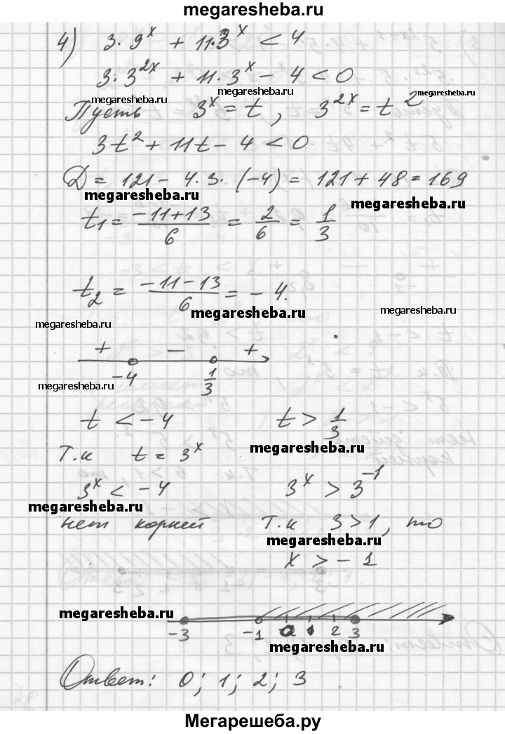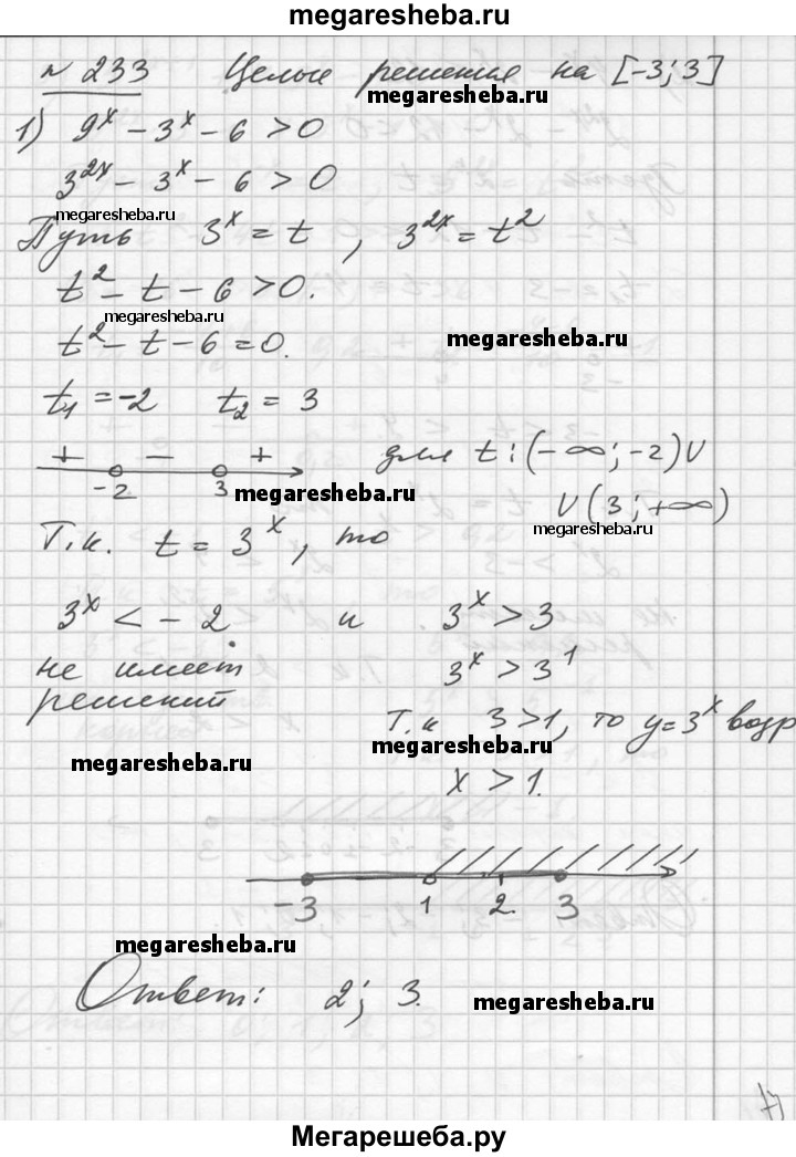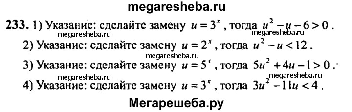 233. Найти целые решения неравенства на отрезке [-3; 3]: 1) 9^x -3^x – 6 > 0; 2) 4^x – 2^x < 12; 3) 5^2x+1 + 4*5^x – 1 > 0; 4) 3*9^x + 11*3^x < 4.
